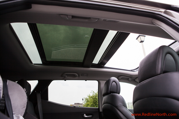 The interior of the Santa Fe felt roomy with high attention to detail. This included built-in sun shades for the rear windows which came in handy on the long car journey with sleeping kids. In addition, the sunroof is immense and fully opened it provides a pseudo convertible feel. This feature made up for the narrow rear windows provided with the redesigned styling, which didn’t allow in that much light.